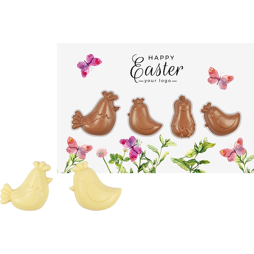 Kort med fyra höns av choklad. Chokladen väger 30 gram totalt. Välj mellan mjölkchoklad och vit choklad. Kortet trycks med digitaltryck.