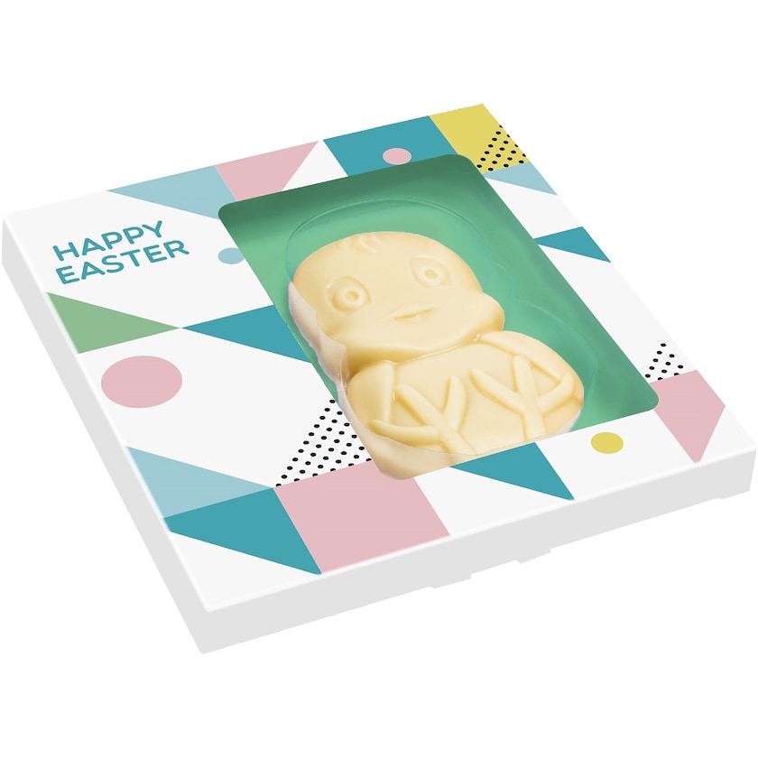 Söt påskkyckling av choklad. Din logotyp trycks på det vita fältet på kartongens framsida. Du väljer själv mellan mjölkchoklad, mörk choklad och vit choklad. En kul påskgåva till dina medarbetare!