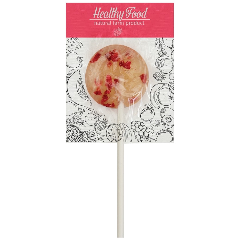 Vegansk, miljövänlig godisklubba med lyxiga fruktbitar. Godisklubbans pinne och omslag är tillverkad av 100% nedbrytbar folie. Detta är rätt val för dig som söker en miljövänlig godisklubba med tryck.