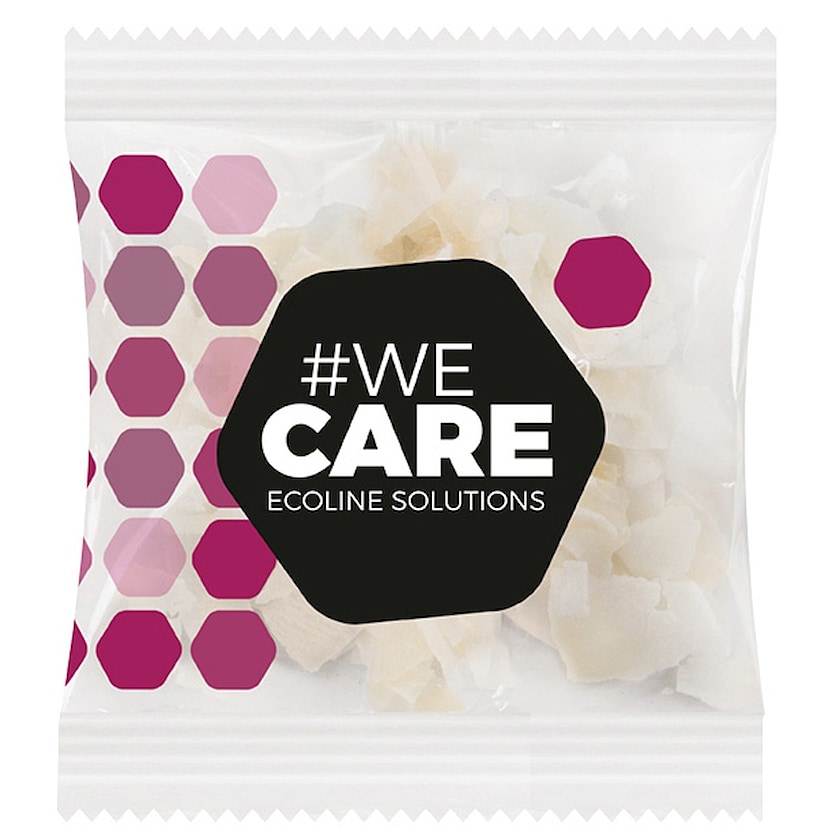 Liten flowpack med chips av banan eller kokosnöt. Ett sunt alternativ! Hela förpackningen trycks efter dina önskemål