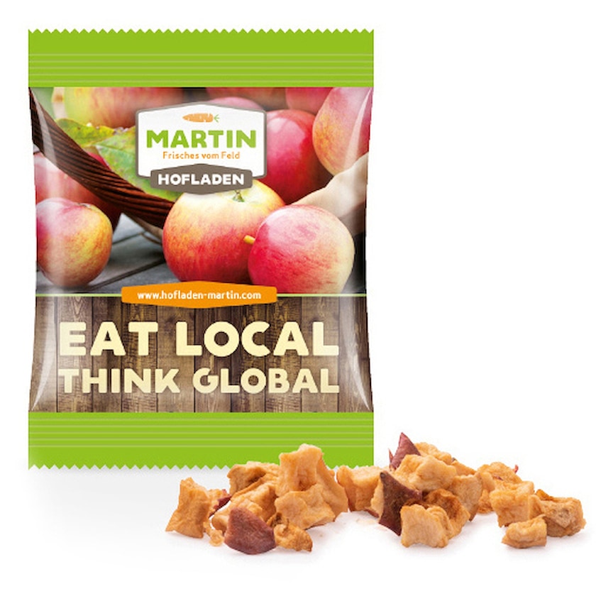 Liten påse med torkade äppelkuber. Ett sunt och veganskt alternativ. Hela påsen trycks efter dina önskemål.