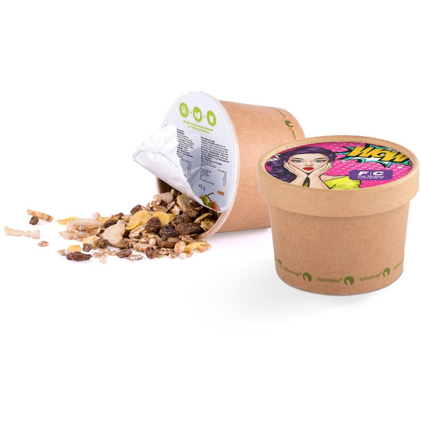 Pappmugg med förstklassig müsli från Hahne. Mjölk kan hällas direkt i muggen. Ett sunt och näringsrikt mellanmål som man kan ta i farten. Välj mellan chokladmüsli med 12,5% choklad eller fruktmüsli med 30% fruktinnehåll. Trycket sker på en pappskiva på muggens ovansida.