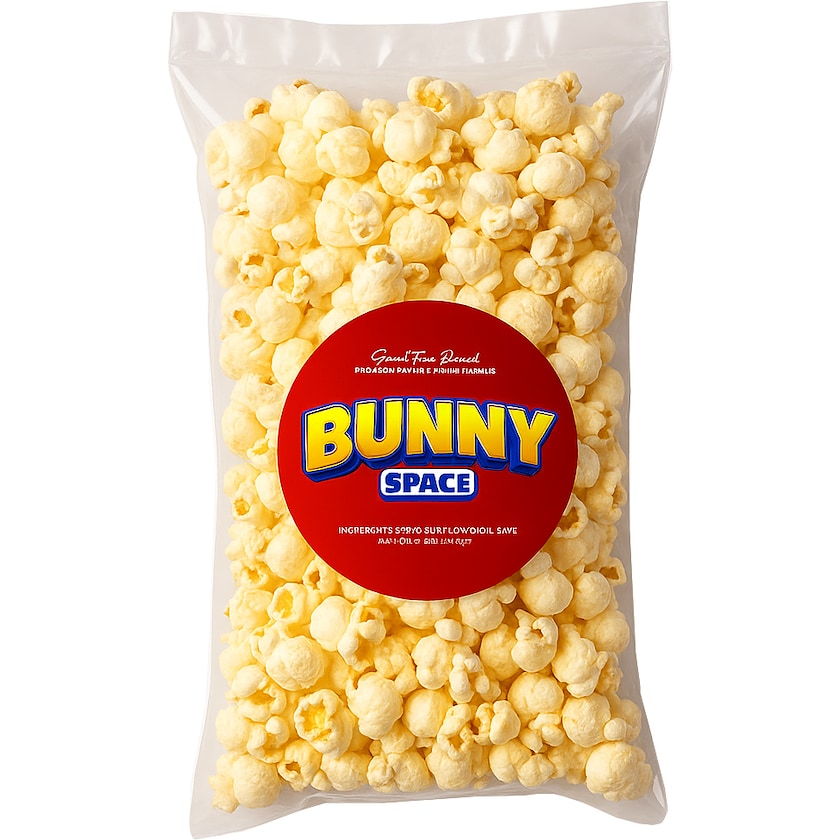 Påse med saltade popcorn som är färdiga att äta. Ett runt klistermärke trycks efter dina instruktioner och placeras på påsens framsida.