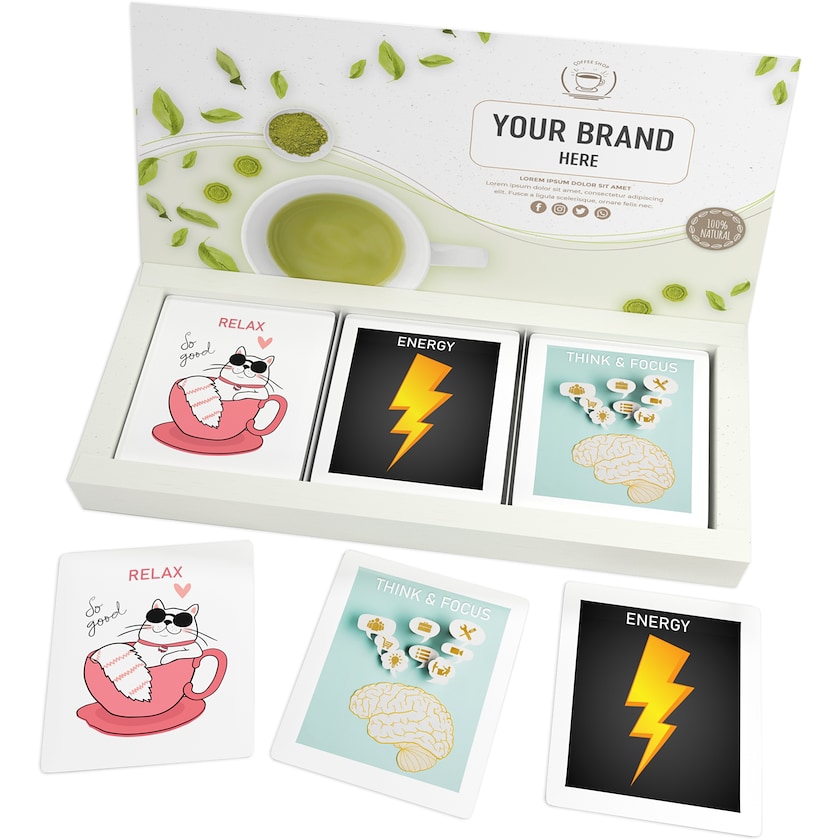 Set med 15 st tepåsar i pappask. Allt förses med ditt tryck! Välj mellan flera olika tesorter. Du kan välja upp till tre olika tesorter, dvs minst 5 st tepåsar av varje sort.