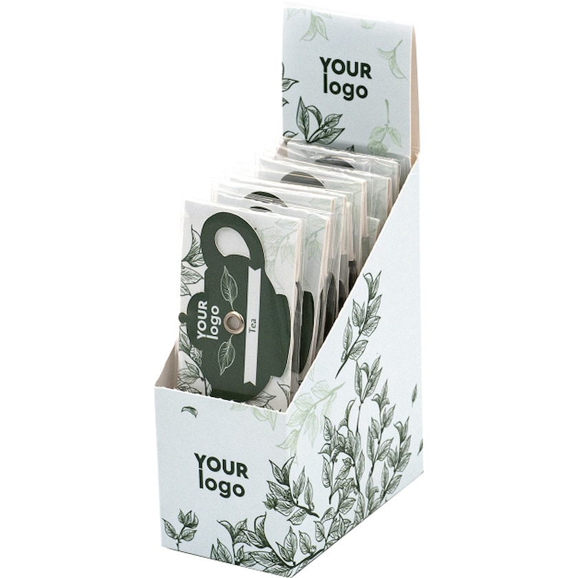 Pappkartong med 10 st tepåsar av typen Shelford. Trycket sker på pappkartongen samt på varje pappersetiketten på varje tepåse. Välj mellan fyra spännande smaker. Perfekt för fikarummet.