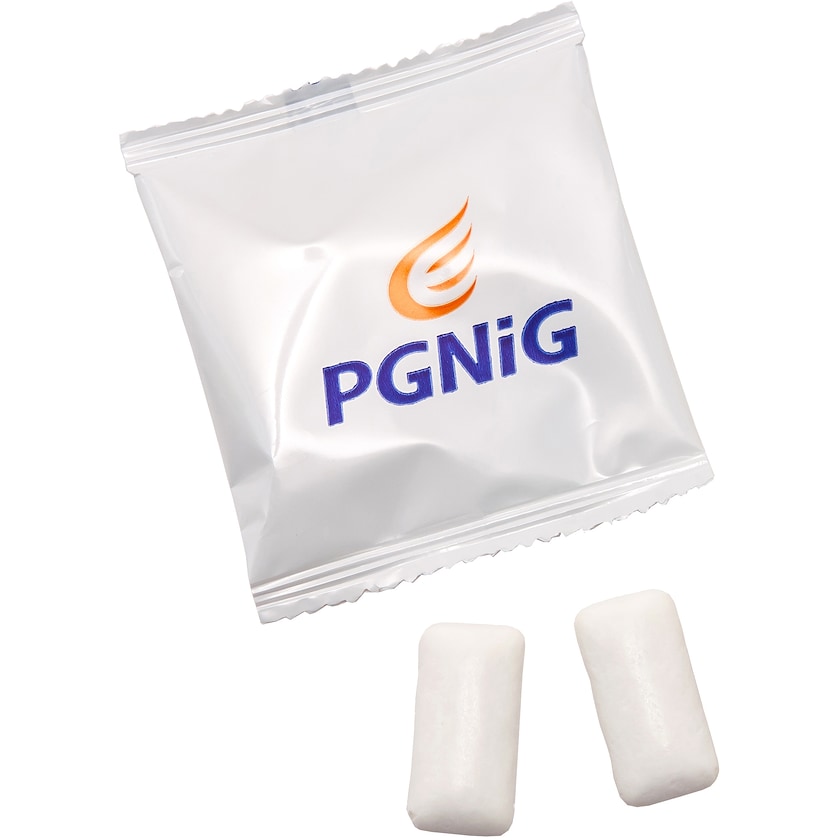 Liten förpackning med två sockerfria tuggummin. Hela förpackningen trycks efter önskemål. Produkten är tänkt att dela ut i stora mängder till en låg kostnad. Trycktekniken klarar därför inte att återge motiven med 100 % skärpa (se produktfoto).