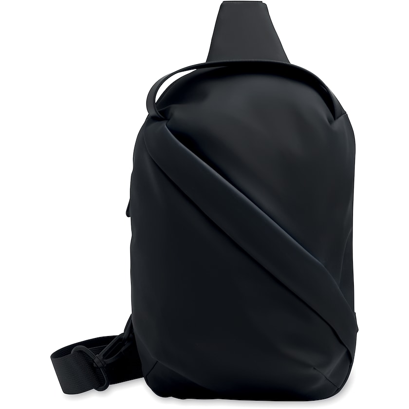 Cross-body-väska av mjukt material. Utöver huvudfacket finns även en mindre ficka framtill med dragkedja. Endast 1-färgstryck.