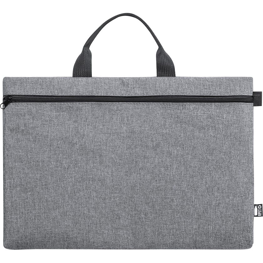 Miljövänlig dokumentväska av rPET. Väskan har ett dragkedjeförsett huvudfack. På sidan finns en etikett som visar att väskan är tillverkad av rPET. Materialet rPET är framställt av återvunna PET-flaskor.