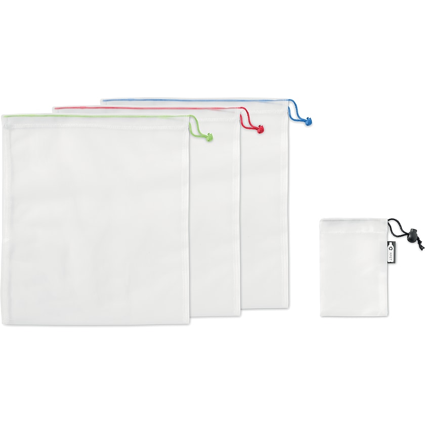 Miljövänligt set med 3 st fruktpåsar och 1 st förvaringspåse. Ett bra alternativ till plastpåsar. Samtliga påsarna är tillverkade av rPET, dvs återvunna PET-flaskor, och är livsmedelsgodkända. Trycket sker på den mindre förvaringspåsen. Påsarna kan tvättas i tvättmaskin. Ett perfekt val för dig som söker fruktpåsar med tryck.