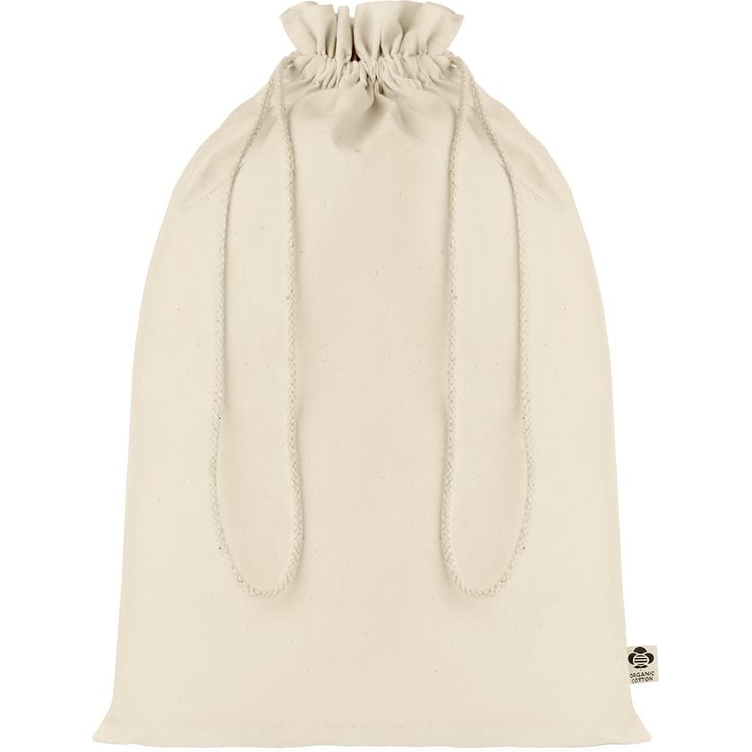 Stor presentpåse av ekologisk bomull. Påsen är tillverkad av ett naturfärgat 105 grams tyg. På ena sidan finns en etikett som visar att påsen är tillverkad av ekologisk bomull.