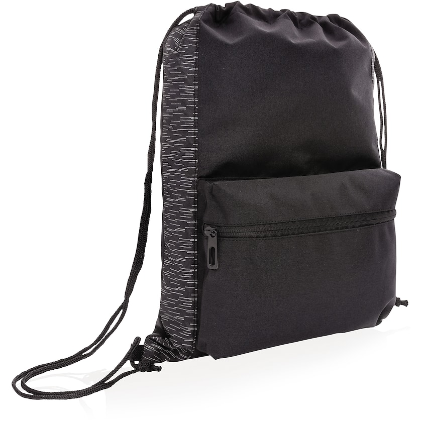 Gympapåse med sidor med heltäckande reflexmönster. Framtill finns en dragkedjeförsedd förvaringsficka. Gympapåsen är tillverkad av rPET, dvs återvunna PET-flaskor.