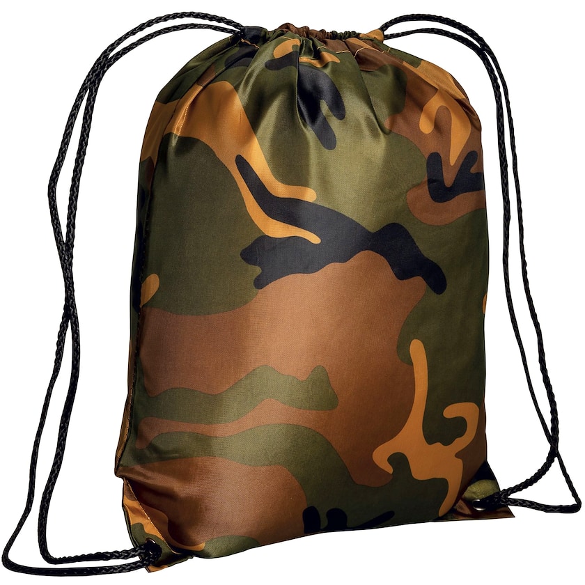 Kamouflagefärgad gympapåse med eget tryck. Gympapåsen är tillverkad av tålig polyester och har förstärkta hörn. Tryck kan ske i maximalt två färger.