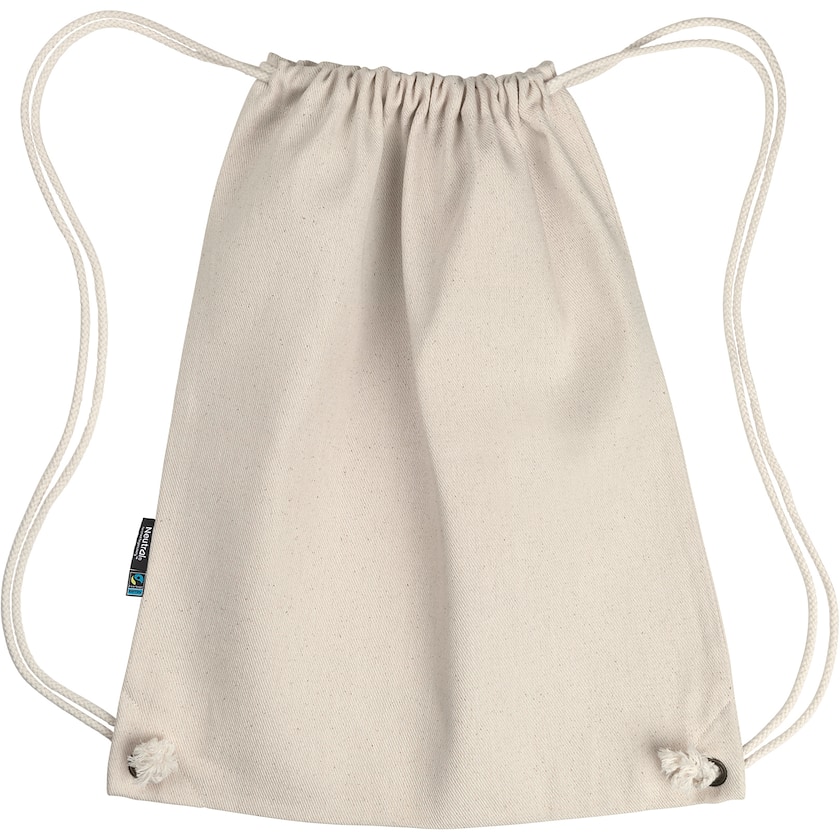 Gymnastikpåse av ekologisk och Fairtrade-certifierad bomull. På påsen ena sida finns tygetiketter som visar att den är Fairtrade-certiferad samt tillverkad av Neutral. Beställ miljövänliga gymnastikpåsar med tryck hos Axon Profil!