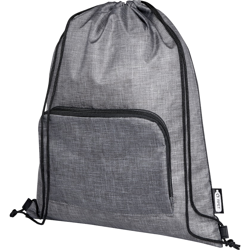 Miljövänlig gympapåse som är lätt att vika ihop. Gympapåsen är tillverkad av återvunnen polyester. Framtill finns en förvaringsficka som också fungerar som förvarings åt gympapåsen när den inte används.