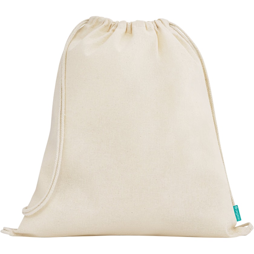 Gympapåse av 100% ekologisk bomull. På ena sidan finns en etikett med texten "organic". Bomullstyget är framställt helt utan kemiska bekämpningsmedel.