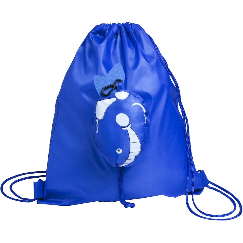 Kul gympapåse som får formen av ett djur när den dras ihop. Gympapåsen är försedd med en karbinhake av plast vilket gör att den lätt kan fästas på t ex ryggsäcken.