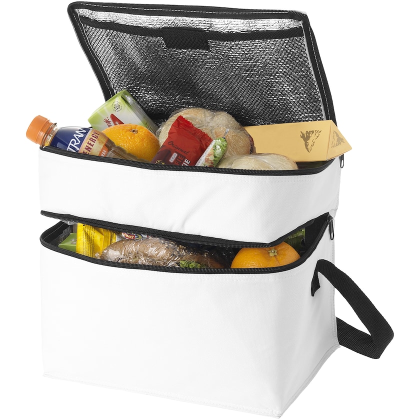 Praktisk kylväska med axelrem och två rymliga fack. Det övre facket är perfekt för mindre snacks och andra kylvaror medan det nedre är idealiskt för större kylvaror. Axelremmen är reglerbar.