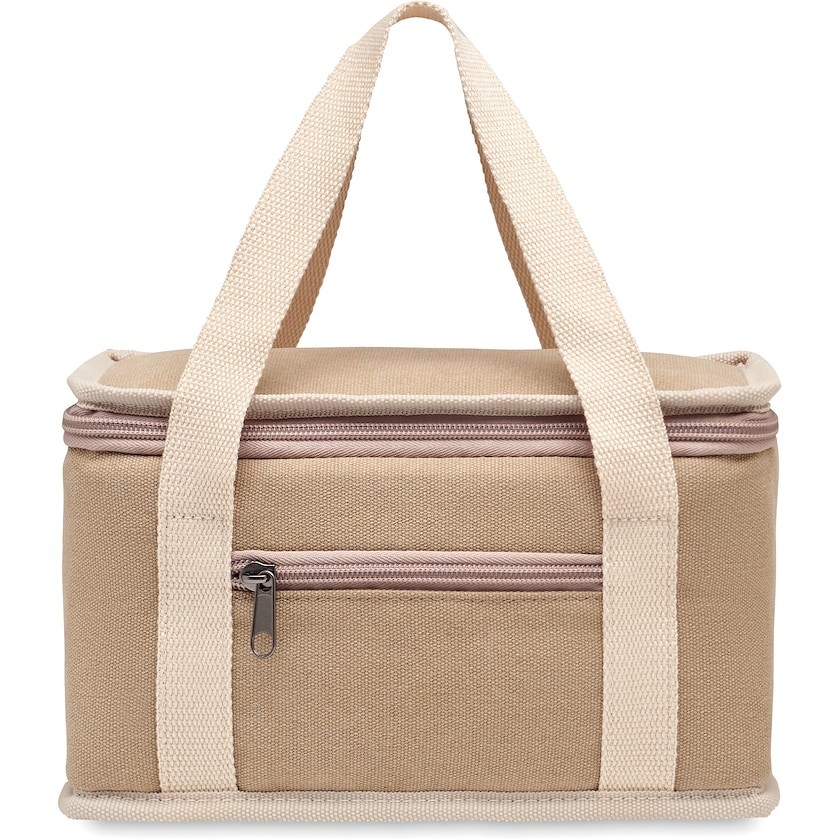 Kylväska med canvastyg och handtag av bomull. På framsidan finns en dragkedjeförsedd ficka.