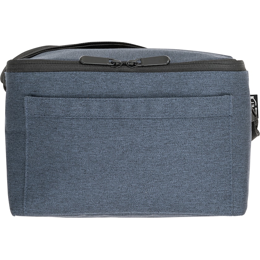 Miljövänlig kylväska av rPET. Framtill finns en ficka för mindre föremål. Väskan rymmer 7 liter. På sidan finns en etikett som visar att den är gjord av miljövänlig rPET.