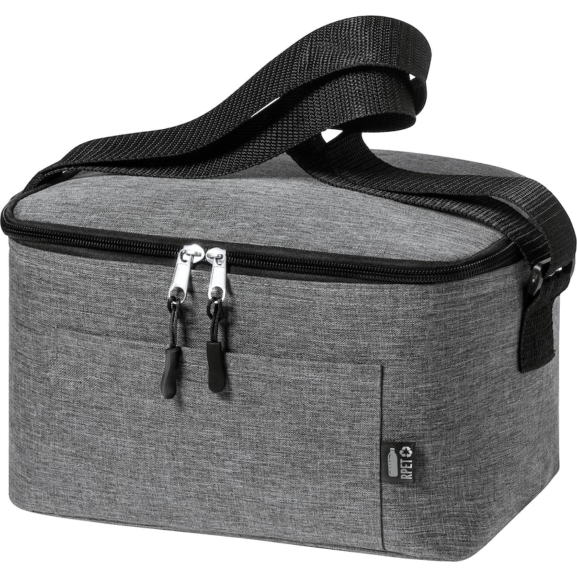 Kylväska av miljövänligt material. Utsidan är tillverkad av rPET, dvs återvunna PET-flaskor. Insidan är klädd i aluminium. På sidan finns en etikett som visar att kylväskan är tillverkad av rPET.