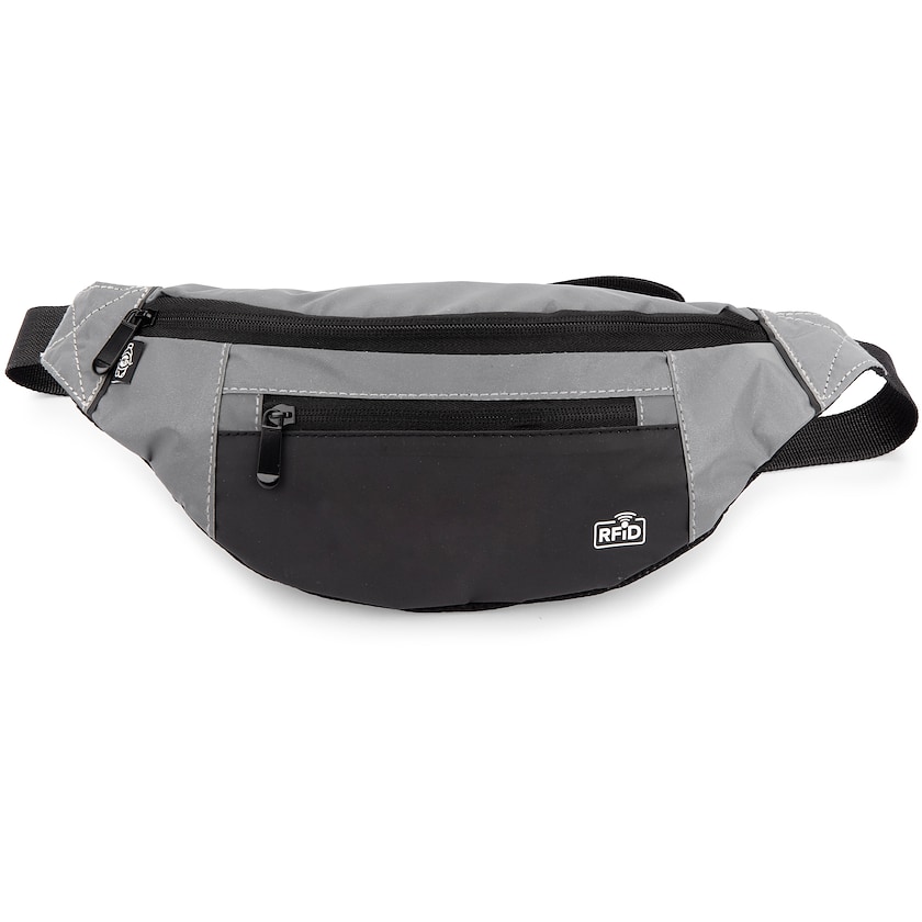 Miljövänlig midjeväska med reflekterande tyg. Midjeväskan har två dragkedjeförsedda fack. Utrustad med en speciell film som förhindrar RFID-skimning.