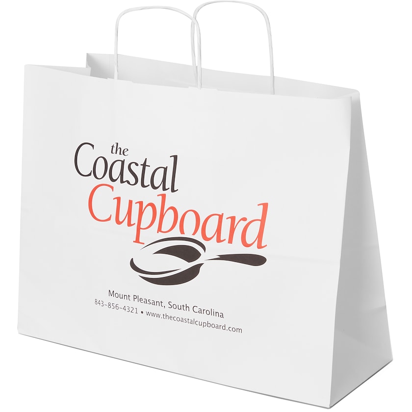 Stor papperskasse i liggande rektangulär form. Papperskassen mäter 32 x 41 x 15 cm och är tillverkad av ett slätt 100 grams papper. Handtagen är tvinnade. Ladda ner tryckmallen och designa själv. Minsta antal är 3000 st. Upp till 15% över- eller underproduktion kan komma att ske. Levererat antal faktureras.