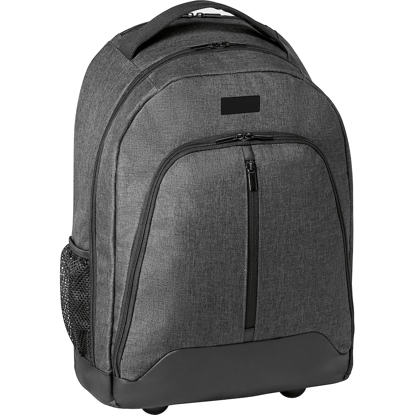 Trolleyryggsäck med vattentätt tyg. Invändigt finns ett vadderat fack för en 15,6 tums laptop. Baksida och axelremmar är vadderade. Märkning kan antingen ske med tryck på ryggsäcken eller med lasergravyr på ryggsäckens metallplatta.
