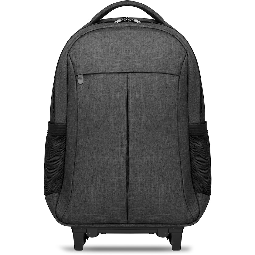 Trolleyryggsäck med hjul. Invändigt finns ett fack för en 15 tums laptop samt ett fack för en surfplatta. Framtill finns en förvaringsficka med dragkedja. Ett skydd för hjulen medföljer så att man slipper smutsa ner kläderna när man bär ryggsäcken.