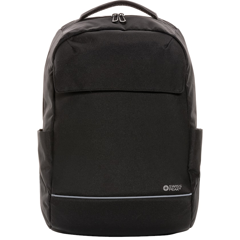Stilfull datorryggsäck från Swiss Peak. Invändigt finns ett vadderat fack för en 15,6 tums laptop. Ryggsäcken är tillverkad av rPET (återvunna PET-flaskor) och är därmed ett bra miljöval.