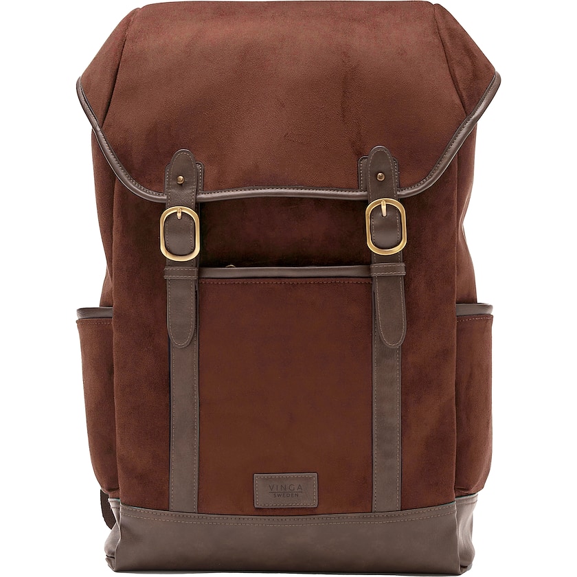 Exklusiv datorryggsäck i klassisk design. Ryggsäcken har ett exklusivt tyg av mockaimitation och vackra mässingsdetaljer. Invändigt finns ett vadderat fack för en 17 tums laptop.
