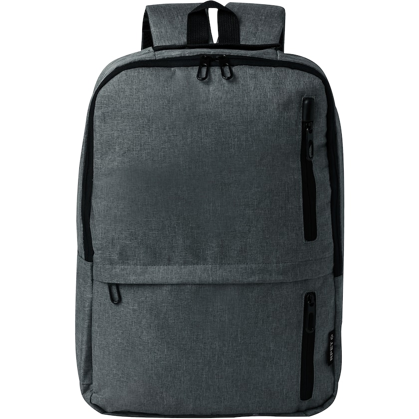 Miljövänlig datorryggsäck av rPET. Invändigt finns ett vadderat fack för en 15 tums laptop samt en 10 tums surfplatta. Baksida och axelremmar är vadderade. Framtill finns även två fickor med dragkedja.