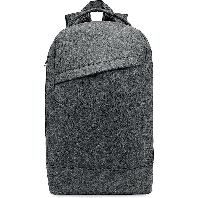 Miljövänlig datorryggsäck av filttyg. Invändigt finns ett vadderat fack för en 13 tums laptop. Filttyget är tillverkat av rPET, dvs återvunna PET-flaskor. På baksidan finns en dragkedjeförsedd ficka för värdesaker.