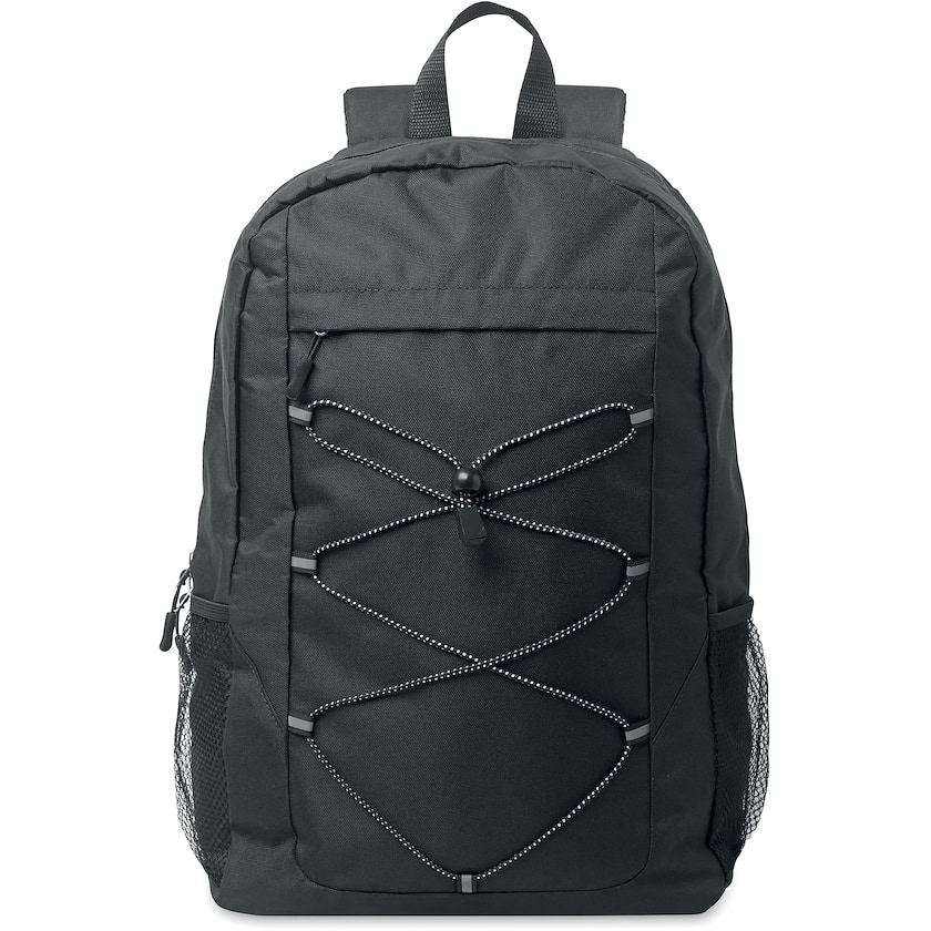 Ryggsäck med tyg av återvunnet material. Utöver huvudfacket finns det en dragkedjeförsedd ficka framtill. På sidorna finns nätfickor.