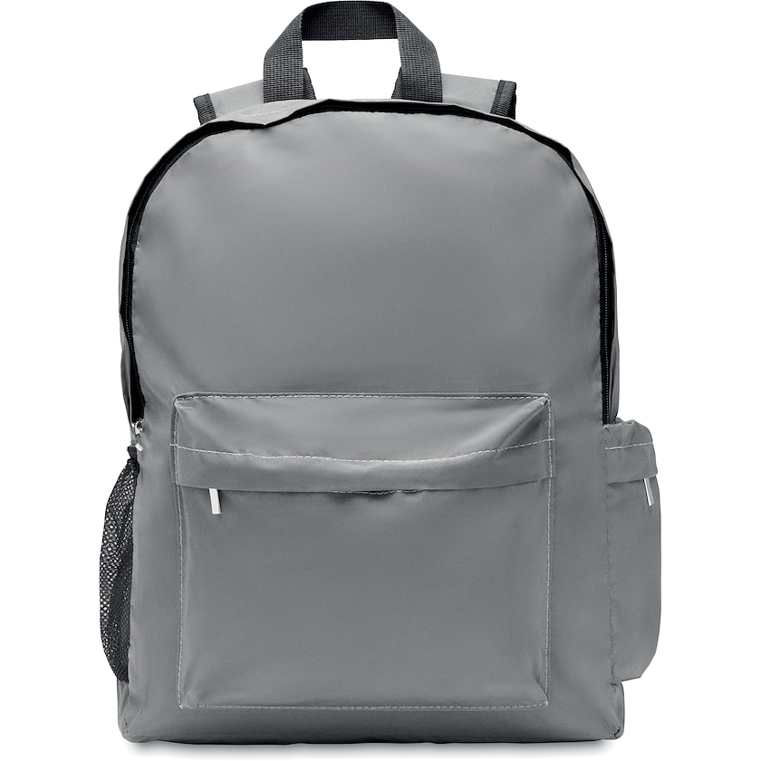 Ryggsäck med högreflekterande tyg. Baksida, axelremmar och botten är vadderade. Invändigt finns ett fack för en 15 tums laptop. På ena sidan finns en ficka med dragkedja och på anda en nätficka.