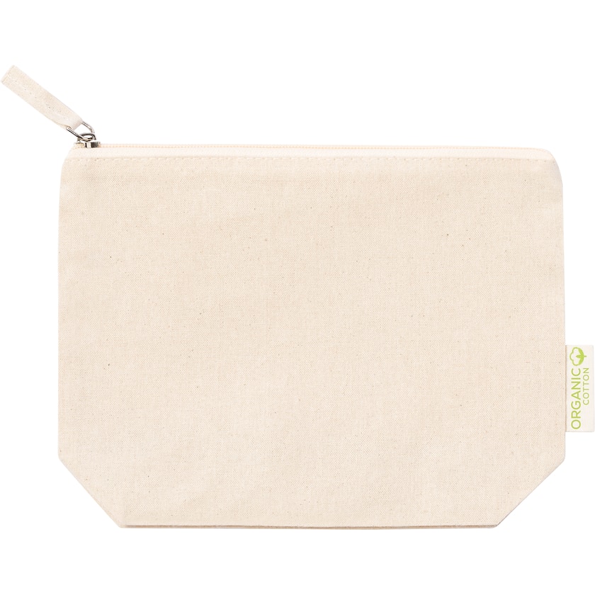Sminkväska av ekologisk bomull. Dijon rymmer de mest nödvändiga makeuptillbehören. På ena kortsidan finns en tygetikett som visar att sminkväskan är tillverkad av ekologisk bomull.
