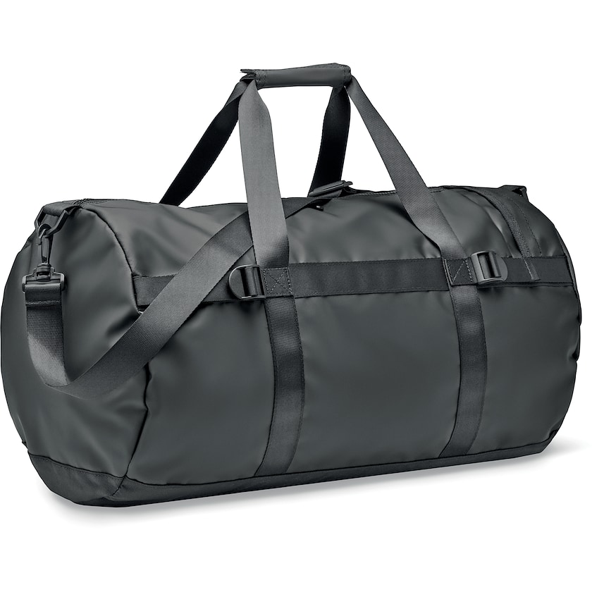 Träningsväska av vattentätt tarpaulin-tyg. Tyget är inte bara vattentätt utan också mycket slitstarkt. Invändigt finns en mindre ficka med dragkedja.