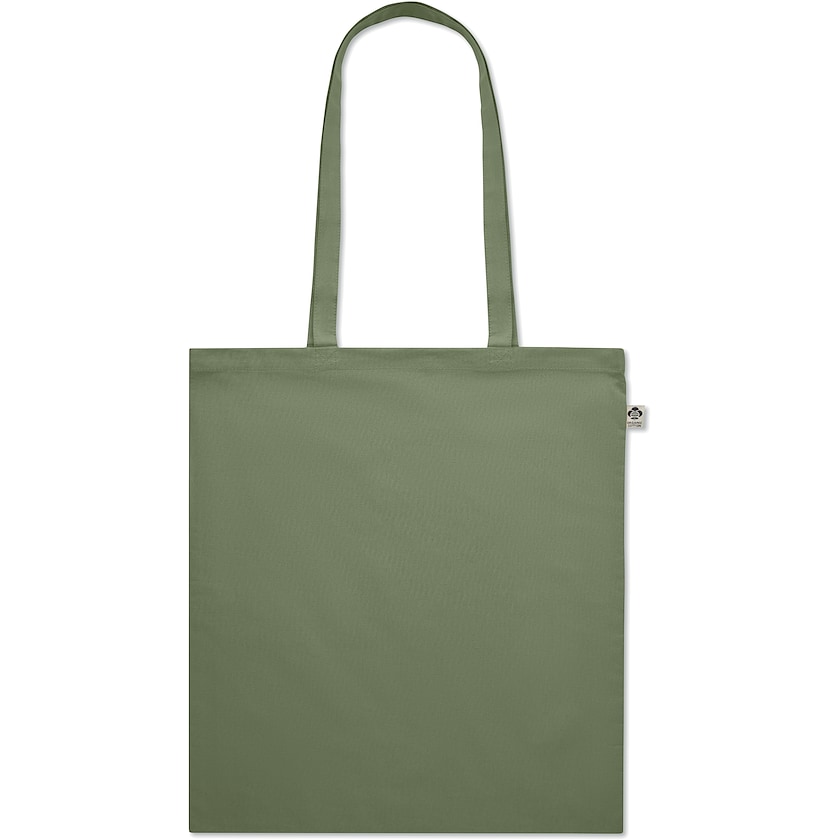 180 grams bomullskasse av ekologisk bomull. Chipman har långa handtag. På ena sidan finns en etikett som visar att den är gjord av ekologisk bomull.