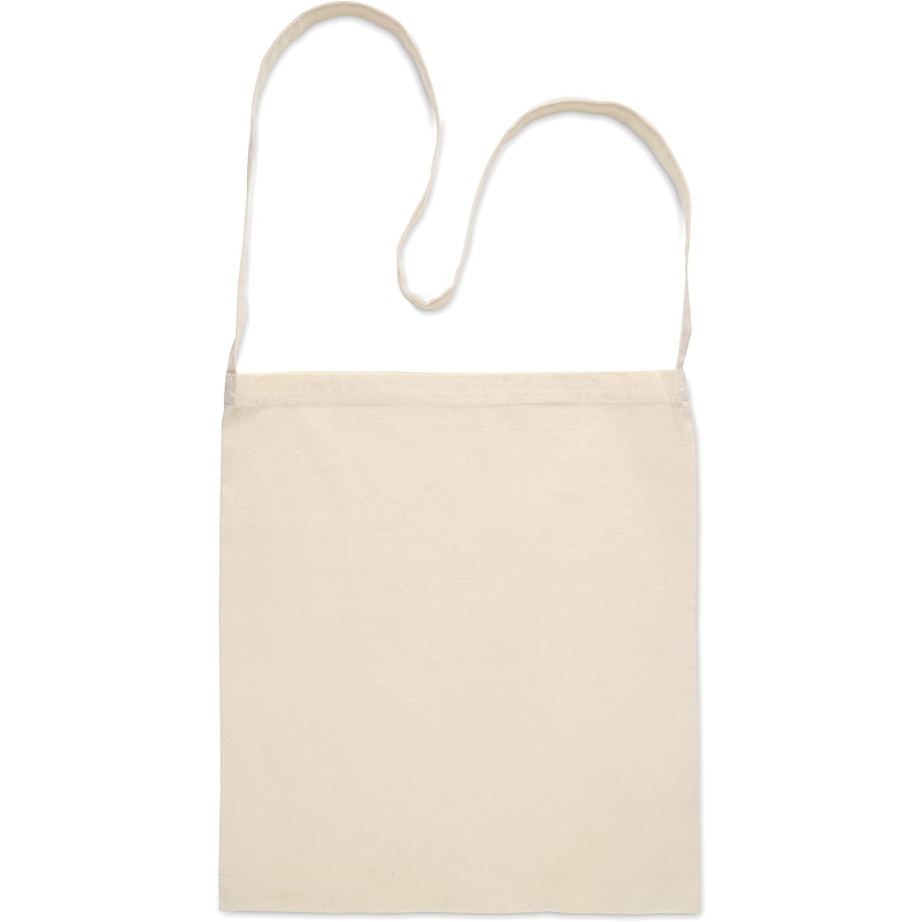 Naturfärgad bomullskasse med ett långt handtag. Det långa handtaget gör att kassen är perfekt att bära över axeln.