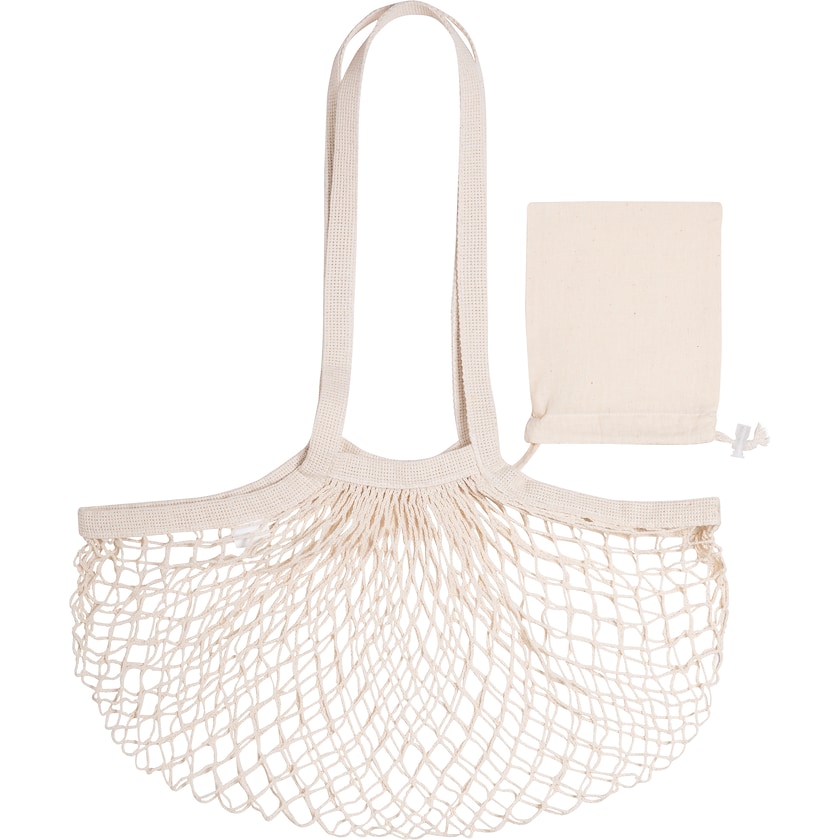 Nätkasse av naturfärgad bomull. När kassen inte används viks den ihop och förvaras i den tillhörande förvaringspåsen. Trycket sker på förvaringspåsen.