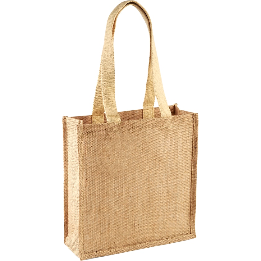 Rejäl tygkasse av jute med handtag i tålig bomull. Kassen kan både bäras över axeln och i handen.