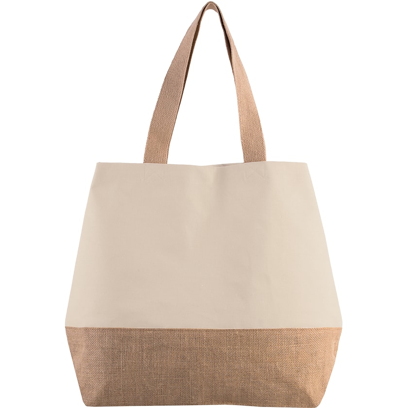 Stor bomullskasse med nederdel av jute. Invändigt finns en dragkedjeförsedd förvaringsficka. Handtagen är 55 cm långa. Kassen hålls stängd med hjälp av en magnetisk knapp.