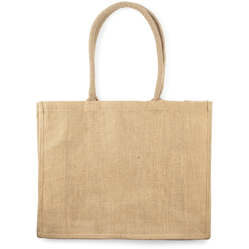 Elegant jutekasse av hög kvalitet. Insidan är laminerad för ökad hållbarhet. Lamineringen gör även att det är lättare att hålla insidan ren. Handtagen är ca 65 cm långa vilket gör kassen lämplig att bära över axeln.