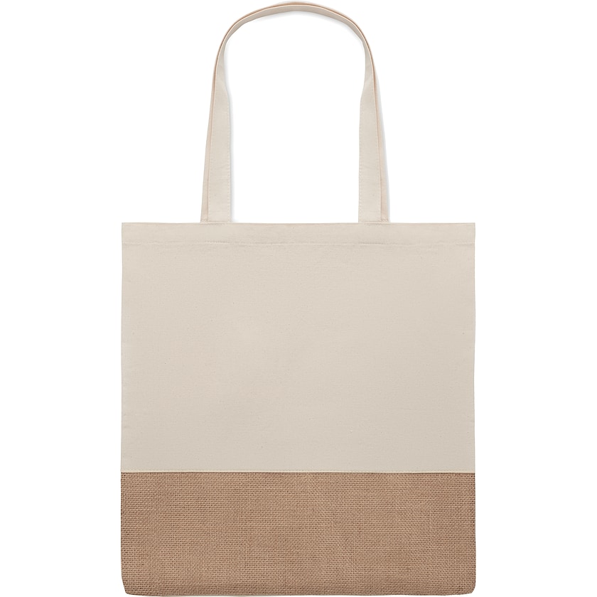 Tygkasse av bomull med nederdel av jute. Tygkassen har långa handtag. En tygkasse av naturliga material med mycket charm.