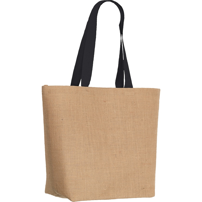Stor och slitstark jutekasse med bomullshandtag. Jutekassens insida är laminerad för ökad styrka. Eftersom tyget är relativt grovt är det inte möjligt att trycka motiv med små detaljer.
