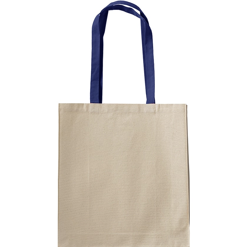 Naturfärgad 220 grams bomullskasse med bred botten och kontrastfärgade handtag. Handtagen är långa vilket gör att man bekvämt kan bära tygkassen över axeln. Den breda botten gör att den rymmer mer än en normal tygkasse.