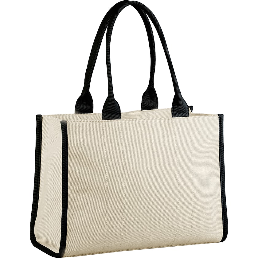 Lyxig strandväska med kraftigt tyg. Invändigt finns en dragkedjeförsedd ficka. Kan både bäras över axeln och i handen. Tyget är tillverkat av en tålig mix av bomull och polyester. Fodret är tillverkat av återvunnen polyester.