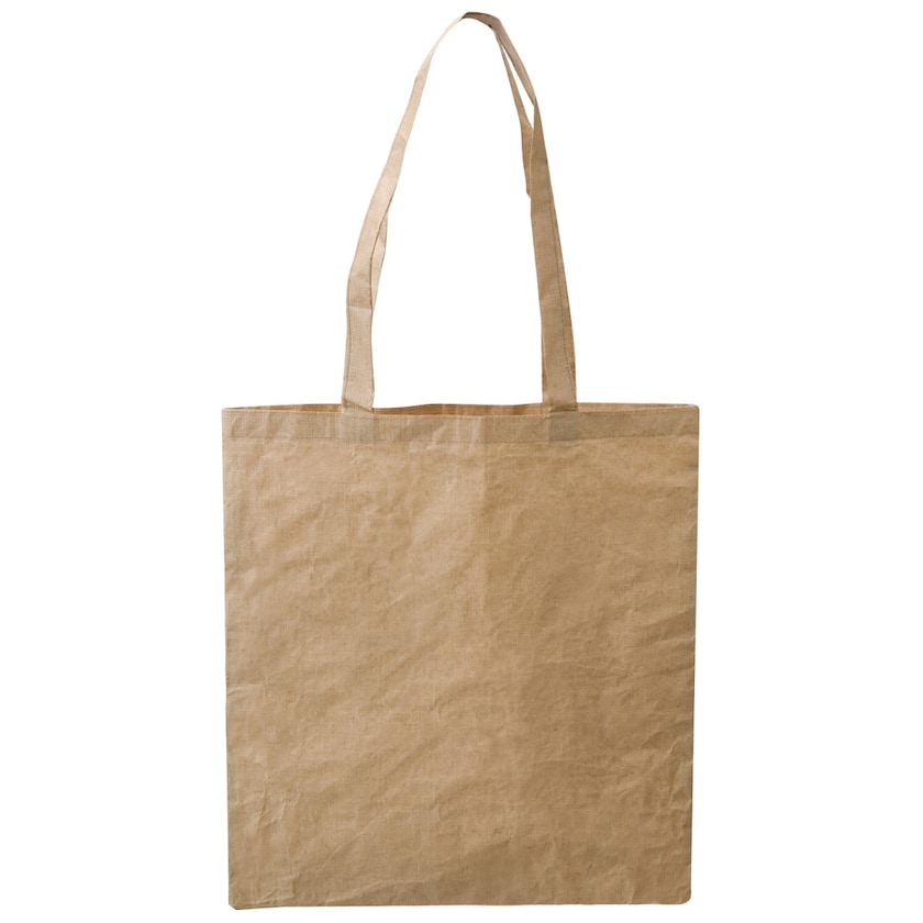 Bärkasse tillverkad av ett tyg gjort av bomull och papper. Handtagen är 60 cm långa vilket gör att kassen både kan bäras över axeln och i handen.
