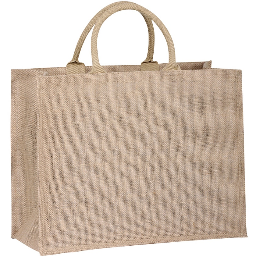 Jutekasse med tryck med korta bärhandtag. Tack vare ett rejält format och en kraftig botten passar den bra för att bära tyngre och mer skrymmande föremål. Jute är dessutom ett miljövänligt material vilket gör kassen till ett bra miljöval. Eftersom jute är ett ganska grovt material är det endast möjligt att trycka enklare motiv.